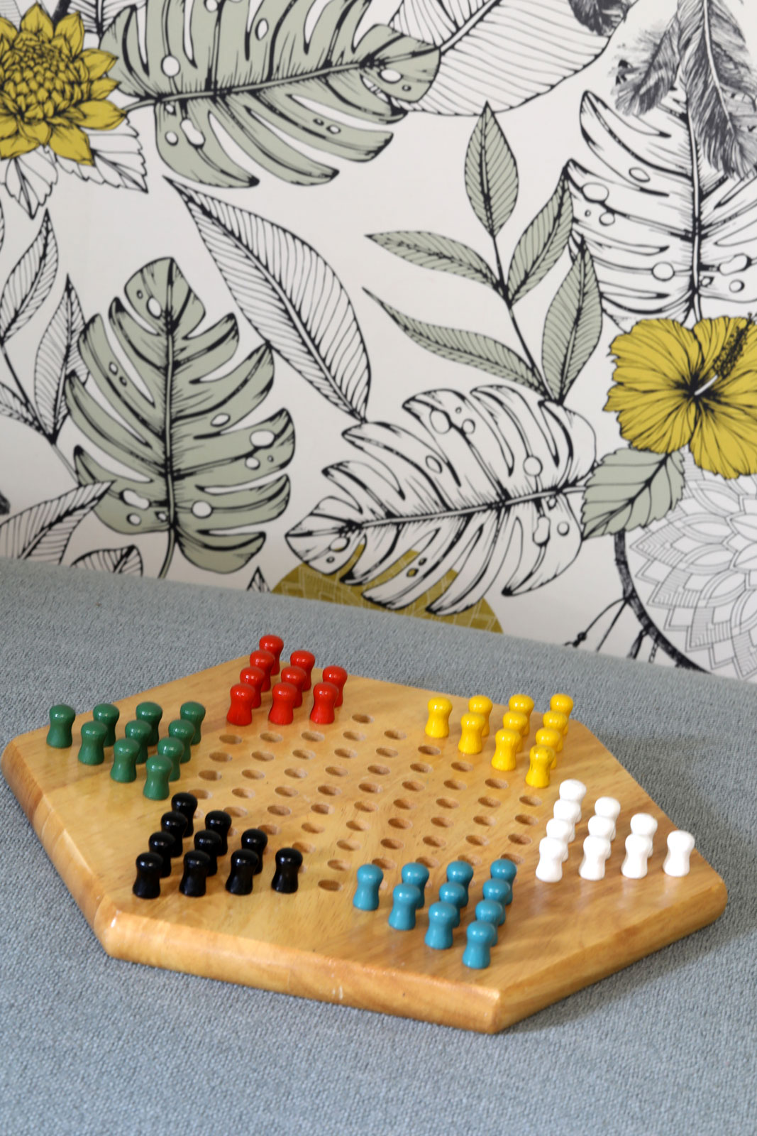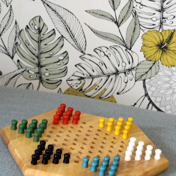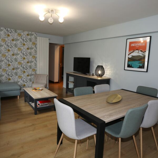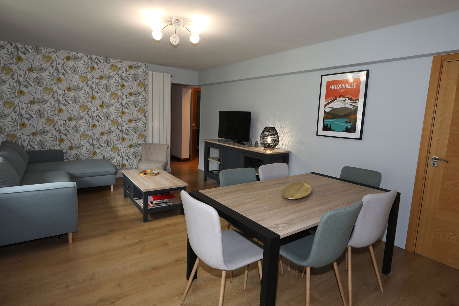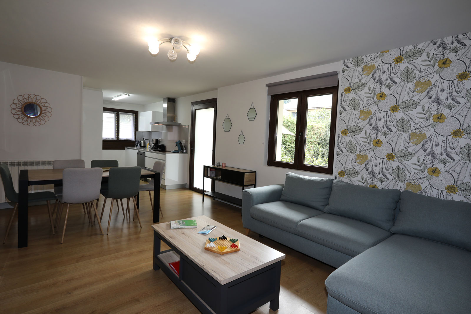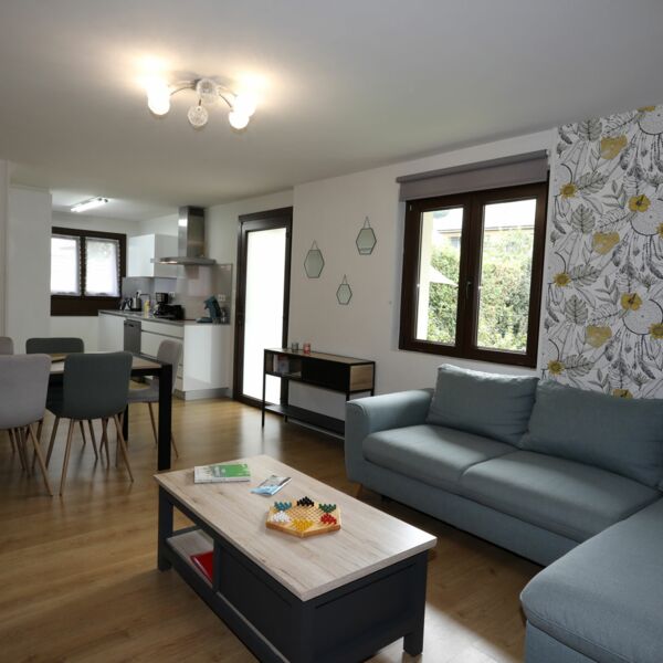 • Le coin salon/séjour dispose d'une table avec ses chaises, d'un grand meuble où est posé la télévision (à l'intérieur des jeux de société pour adultes, enfants), un meuble console avec des jeux pour enfants et des livres pour enfants et adultes, un canapé d'angle et un fauteuil.
