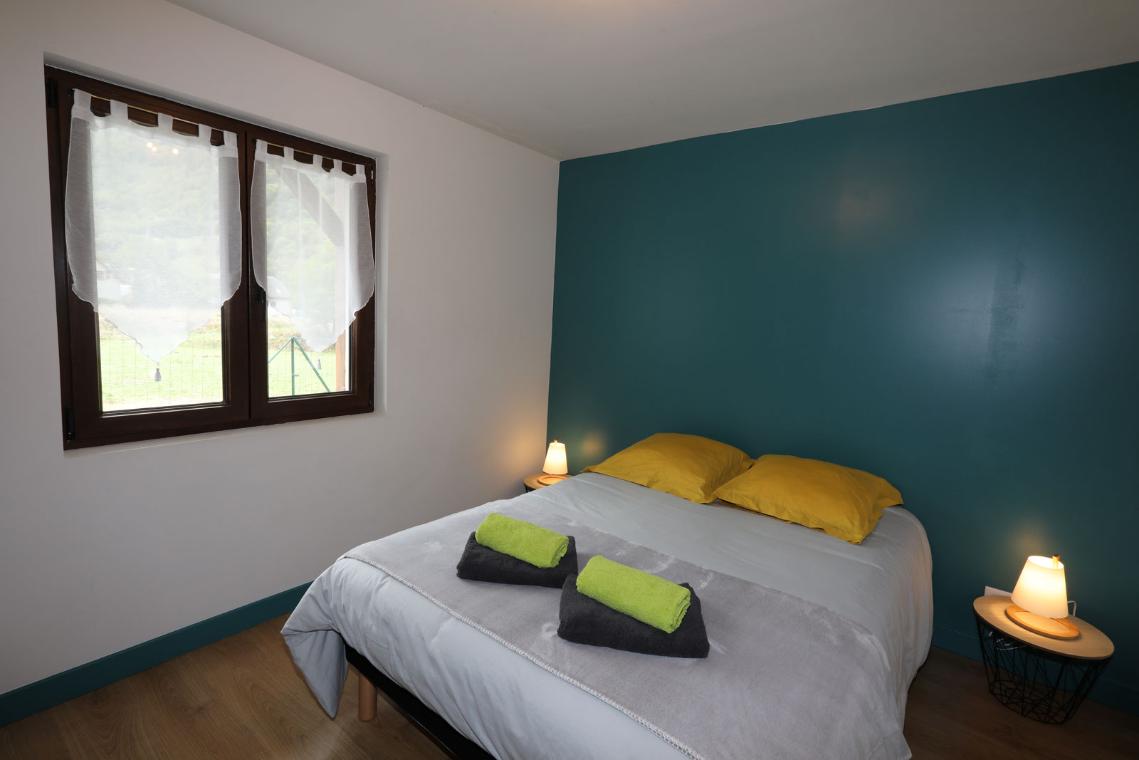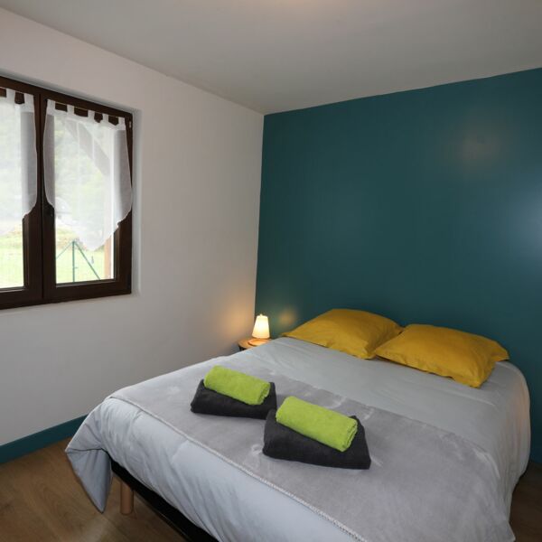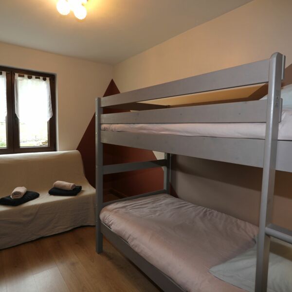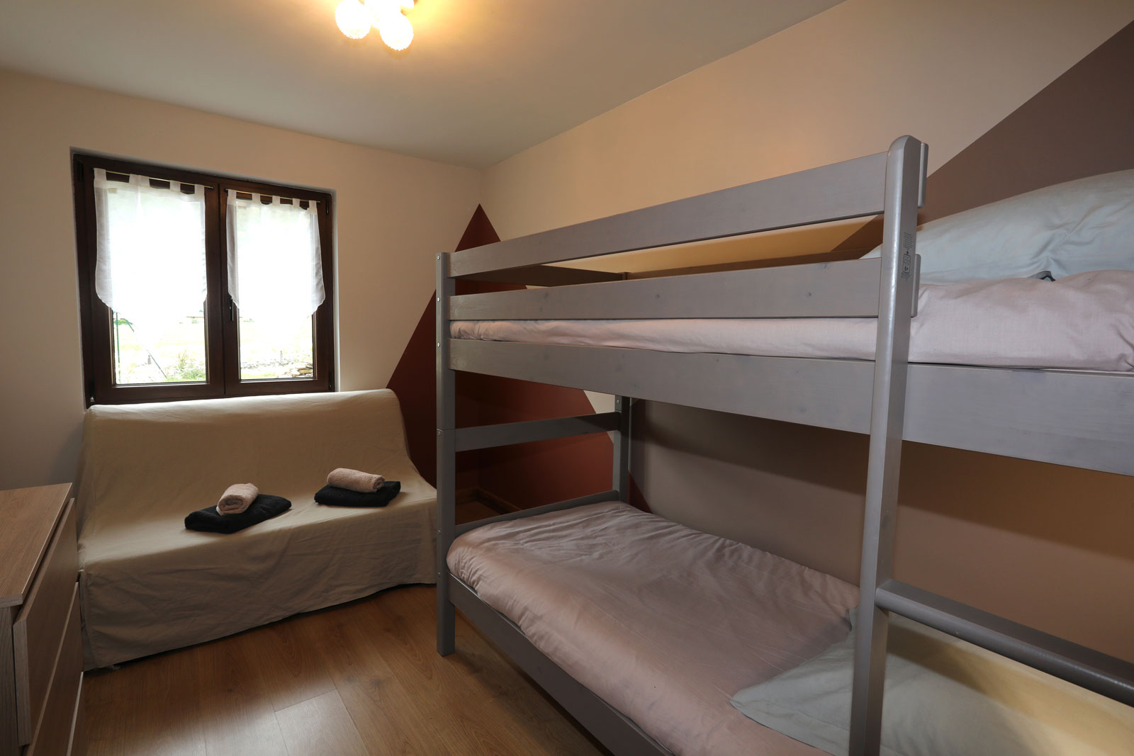 • Il y a deux chambres avec chacune un lit 140x190 cm, 2 chevets, 2 lampes, l'une avec un portant et l'autre un dressing. Il y a aussi une troisième chambre avec 2 lits superposés 90x190 cm et un BZ en 140cm, une commode et un chevet avec une lampe pince.