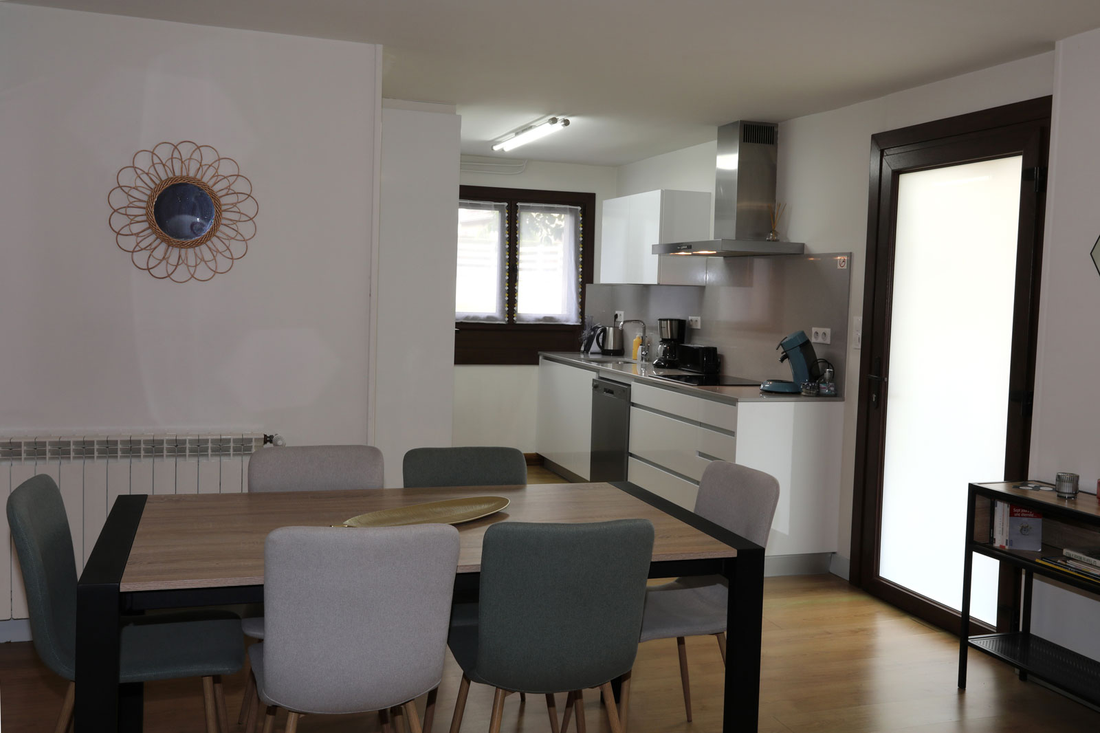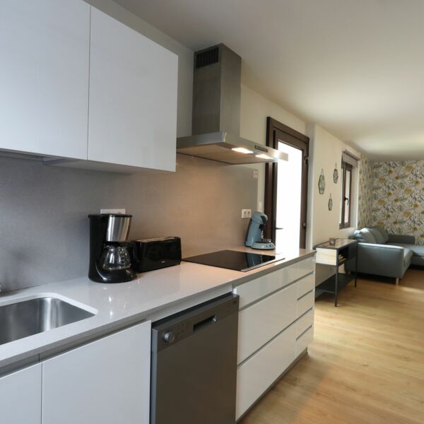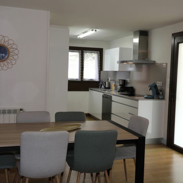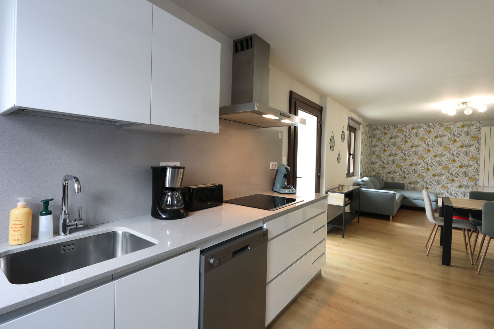 • Cuisine équipée d'une plaque à induction, d'un four, d'un réfrigérateur/congélateur, d'un lave-vaisselle, d'un micro-onde, d'une cafetière avec un filtre permanent, d'une cafetière Senséo, d’une bouilloire, d'un d'appareil à raclette, d'un service à fondue, d'un râpeur – trancheur et d'un mixeur plongeur.